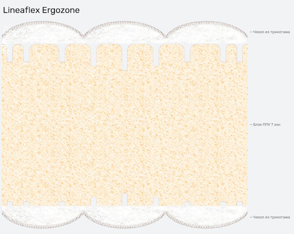 Высота матраса Эргозон составляет 18 см. Уровень жесткости «средний». Рассчитан на семейную пару. Комплектуется эластичным чехлом класса комфорт из натурального трикотажа. Рекомендуемая максимальная нагрузка на одно спальное место – 140 кг.