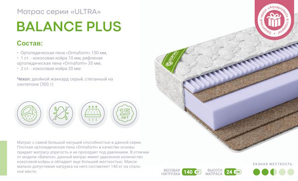 Матрас с самой большой несущей способностью из всех производимых. Плотная ортопедическая пена «Ormaform» в качестве основы придает матрасу упругость и не проседает под давлением. В отличии от модели «Balance», данный матрас имеет удвоенное количество кокосовой койры и обладает еще большей жесткостью. Максимально допустимая нагрузка на него составляет 140 кг на спальное место.